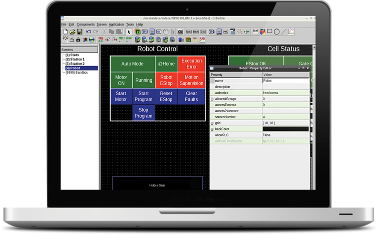 OI Builder is the application used to create interfaces. Available for Windows and included on OI screens, it is modeled after industry standard applications. It features many of the common components as well as several developed specifically for machine interfaces: