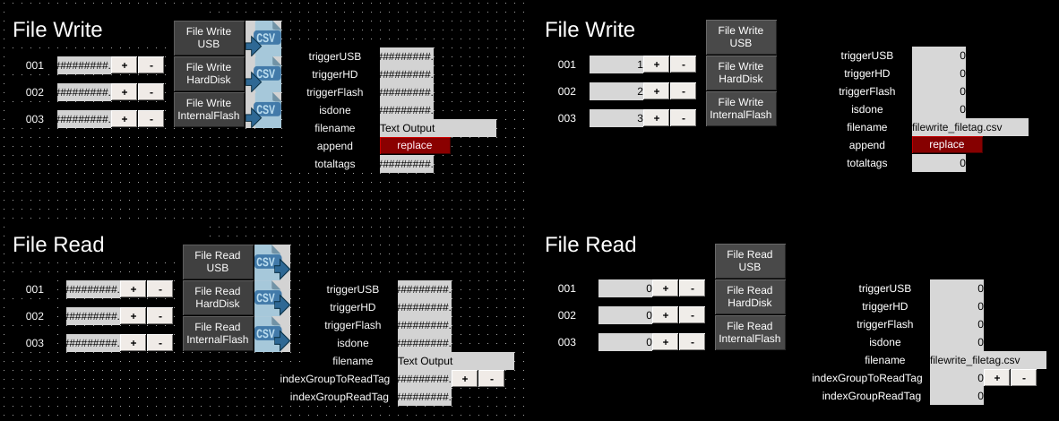 The File Read and File Write components provide the ability to read and write from the filesystem. Data is stored in a limited CSV file format: