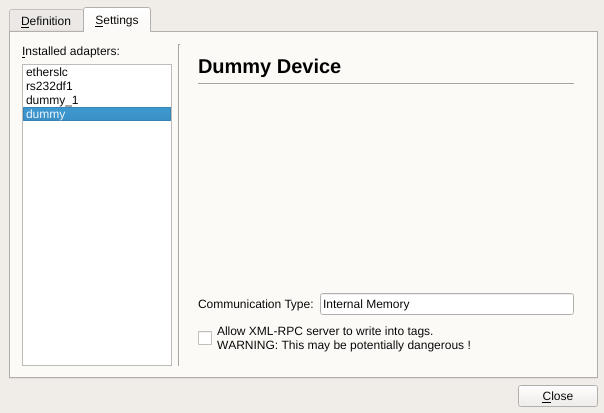 Dummy devices have no settings to edit as they act merely as tester devices for protocol types. The only variable here is the communication (or protocol) type which is set when installing adapters on the 'Definitions' page.