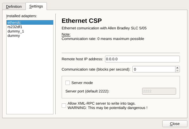 This adapter provides Ethernet CSP communication with Allen Bradley SLC 5/05 PLCs.