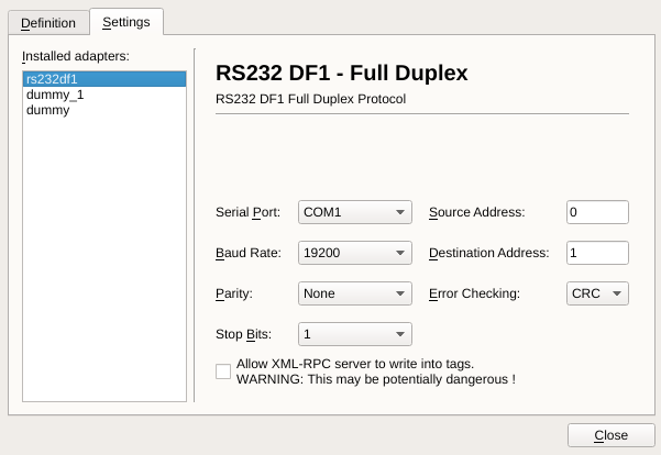 This adapter provides RS232 (serial) communication with Allen Bradley PLCs using the DF1 protocol. The following settings can be changed for this adapter: