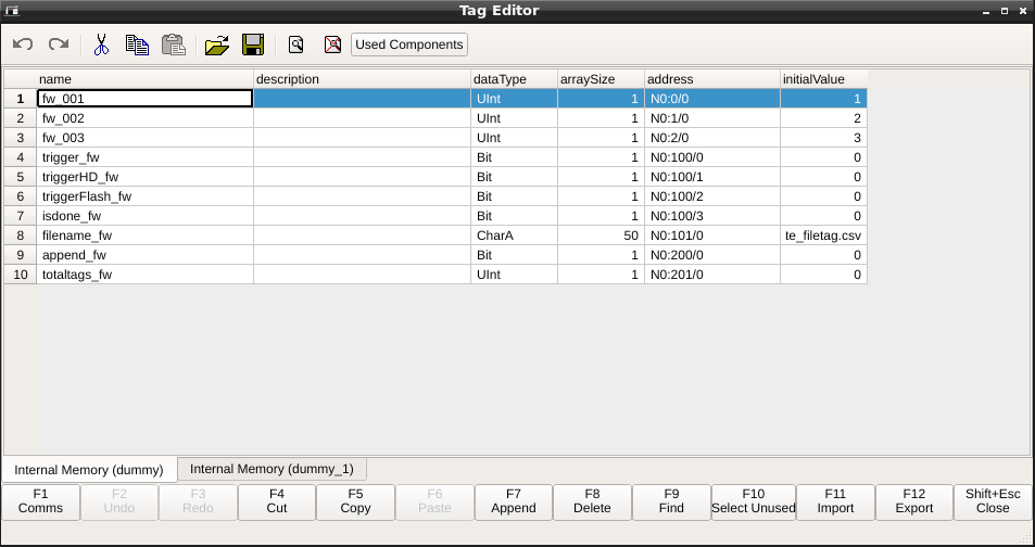 The 'Address' column specifies a unique address at the programmable logic controller for each tag. Adjust the address for a tag by double clicking a chosen row in this column and enter an address using a keyboard. Address formats are determined by the communication adapter. See the communications page for more information.