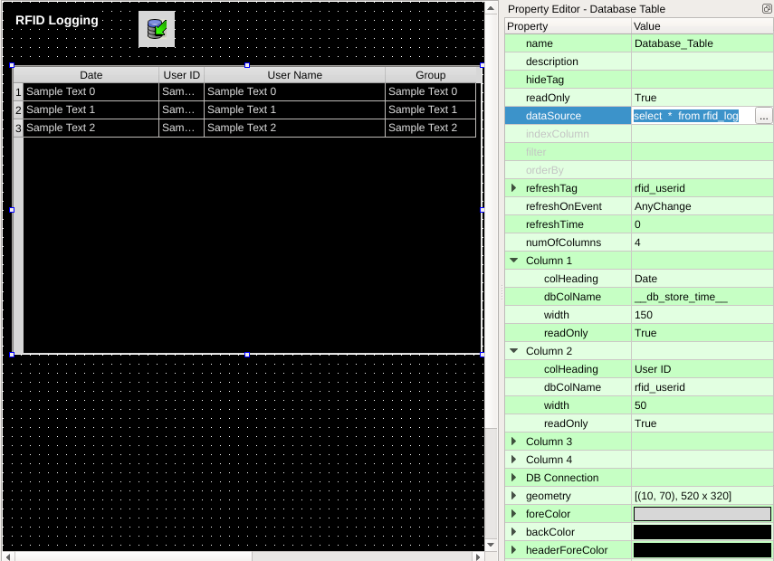 dataSource: This is the SQLite query that provides the data. Here we will use: select * from rfid_log