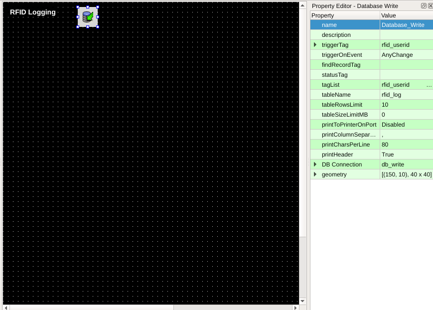 The sample program logs RFID scans to the database using Database Write and Database Table components.